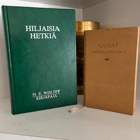 Erinomaisessa kunnossa oleva kovakantinen pieni kirja muovikansissa. Omistuskirjoitus
