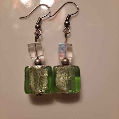 Myydään suomalaista taidekäsityötä olevat Soda Shop Designin lasiset korvakorut. Väreinä vihreä ja kirkas. Käyttämättömät.