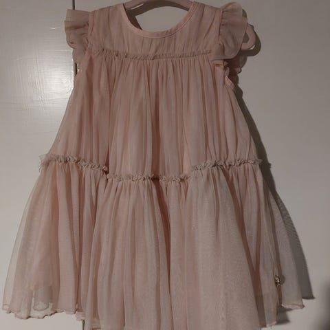 Myydään Pomp de lux juhlamekko, koko 92 cm. Mekon etupuolella (oikealla) paljeteissa menee langanveto, mutta paljetit ovat kiinni ja tallella.