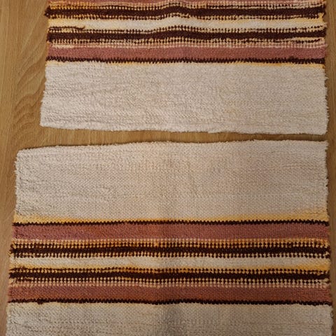 Poppanaliina 110sm pituus ja leveys 45 cm..Luonnon valkoinen ja tummaa liilaa olevaa 6 raitaa kummassakin päässä,hillitty liina