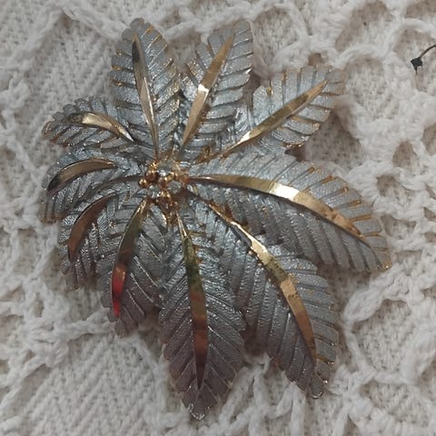 Metallinen palmu rintaneula, pituus 7,5 cm. Mahdollisuus käyttää myös riipuksena. Siistikuntoinen ja näyttävä koru.
