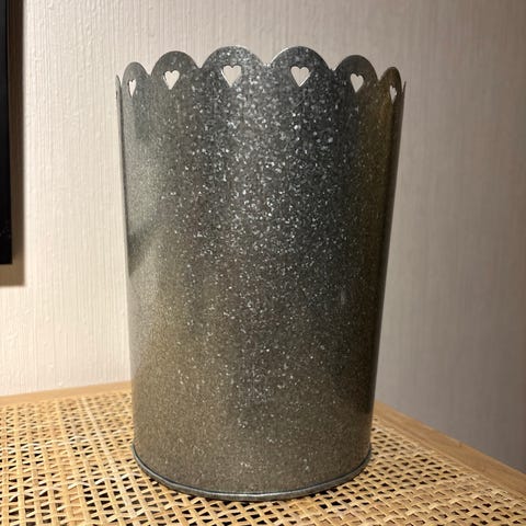 Matta harmaan- hopeaa peltiä. Käytetty. Korkeus 30 cm. Halkaisija alhaalla 15 cm, ylhäällä 22 cm.