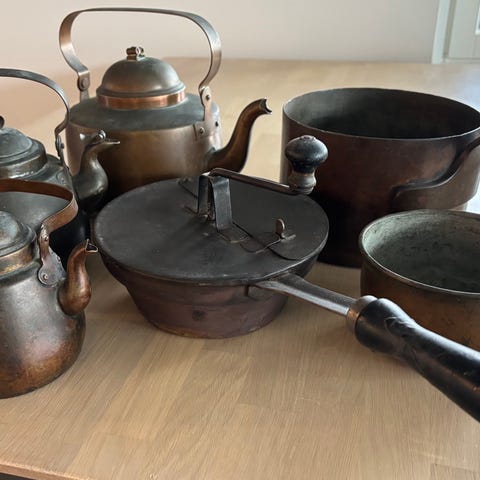 Vanhat käsintehdyt Coppers kupariastiat 3kpl. Aidosti ja hienosti patinoituneet. Korkeus 9cm ja leveys 13cm.