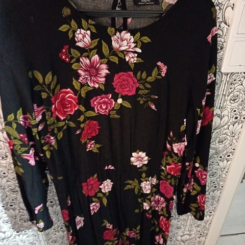 Tummansininen ruusukuvioinen pehmeää ilmavaa kangasta H&M mekko. Pääntie melko antava, koko 42, kainalosta helmaan noin 76 cm ja kainalo-kainalo 61 cm. Kisutalous.