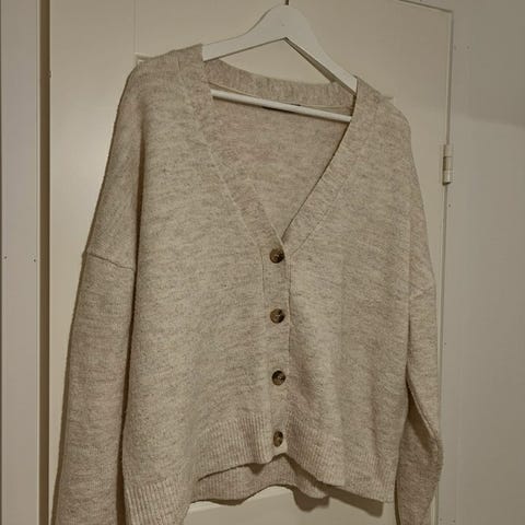 Kudottu, paksuhko jakku/villatakki 70% akryyli, 30% alpakka. Ylhäällä kaksi painonappia ja yksi iso nappi kauluksessa, muuten avoin. Jonkin verran alaspäin levenevä helma ja hihat, joissa resorit. Kaksi taskua.