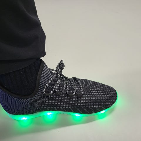 Tällaisia kemukenkiä ei Suomesta saa; kenkien koko ulkopinta on valaistu, toisin kuin halpismalleissa. Lataus kätevästi USB-johdolla. Mukavat ja pehmeät jalassa.