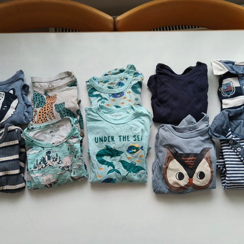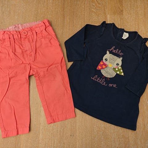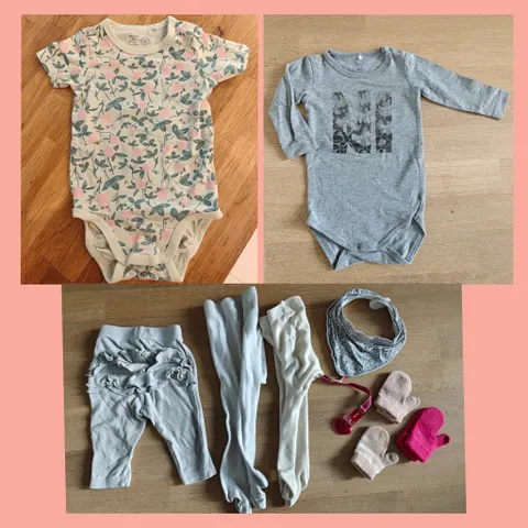 Pipot ja housut olleet käytössä. Bodyt ovat käyttämättömiä. Eivät ole meille oikean värisiä. Meillä ei ole lemmikkejä, mutta koska vaatteet ovat ostettu muiden vaatteiden yhteydessä en voi eläinpölyttömyyttä taata.