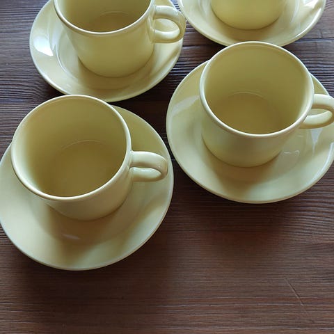 Erittäin siistissä kunnossa olevat mukit ja lautaset.Väri punainen.Mukeja on 8 kpl, 6 Leipälautasta 1 Syvä lautanen, 1 neliskanttinen lautanen. Kaikki yhteishintaan.