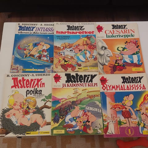 Kolme Asterix sarjakuva-albumia, 1. painos jokaisesta. Asterixin Obelixin syntymäpäivä -albumissa kannessa hiukan kulumaa, muuten hyväkuntoiset albumit.