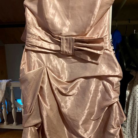 Naisten pinkin värinen silkkinen juhlamekko. Spagettiolkaimet, iso halkio. Helma muhkea. Käytetty kerran.