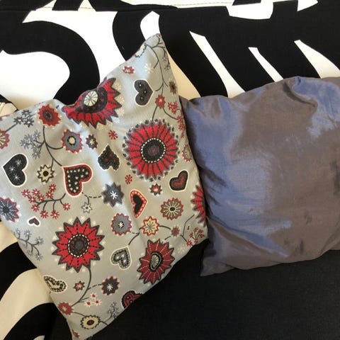 Mummon neliöistä puuvillalangalla virkattu tyynyn päälinen ja toinen puoli tummanpunaista vuorikangas silkkiä. Tyynyn päälinen varustettu vetoketjulla. Koko 40 Cm x 40 cm. Pehmeä.