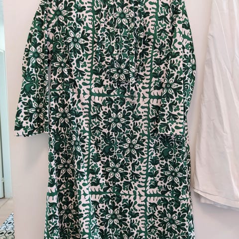Sivuissa taskut ja vyöllä saa siluetin näkyviin. Kaunista paksua popliini puuvillaa. Ei jousta.