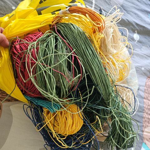 Kangaspuissa kudottu kukkakimppu. Varren saa rullattua auki.