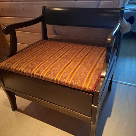 Kunnostettu vanha tuolisänky, siisti, tukeva , venelakalla lakattu (sisä-sekä ulkopuoli) istuimeen laitettu nupinauloilla uusi aito nahka.