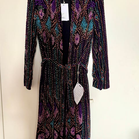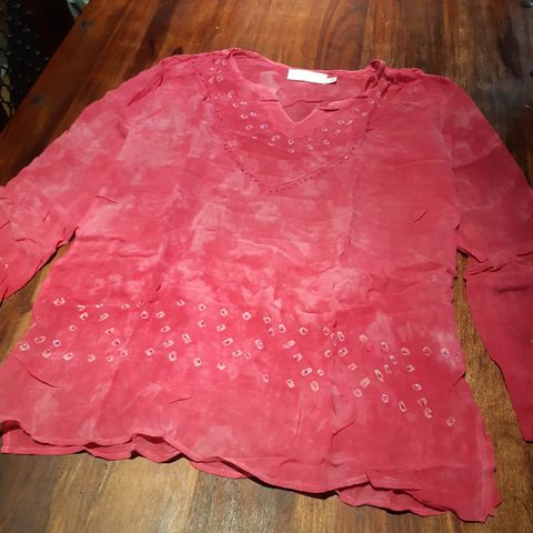Ranskalainen Antik Batik upea sifonkipaita, koko S. Paidan nimi on Noemie Kurta. Paidassa on koristeena kultaisia paljetteja, myös hihoissa ja takaosassa. Kaula-aukossa on solmittavat nauhat, samoin helmassa. Vartalon kohdalla on vuorikangas. Materiaali on 100% viskoosia, laskeutuu erittäin kauniisti. Paidan mukana tulee varanappi ja paljetteja. Uusi.