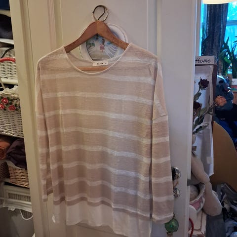 Mittoja: kainalosta kainaloon 46 cm, kaula-aukosta hihansuuhun 64 cm, niskasta helmaan 59 cm.