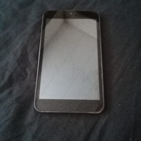 Tabletti Denver TAC-90012, joka käynnistettäessä jämähtää kuvassa näkyvään tilaan. Lisäksi näytön lasi on säröillä.