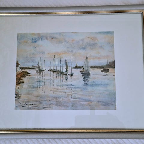 Eva Lundgrenin vanha purjeveneaiheinen aito vesivärityö 1885, mitat n.50 x 68, hp.25 e.