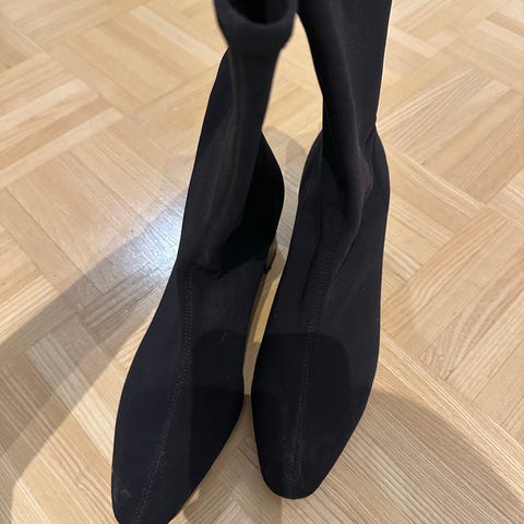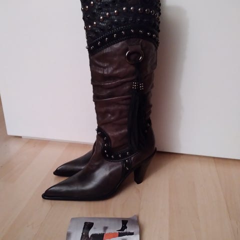 Myydään uutena ostetut ja kerran jalassa käyneet saappaat. Hieno kimaltava ryppyinen varsi. Korko 11cm. Itselle pienet.