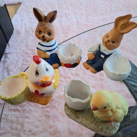 Käyttämättömät , värikkäät munakupit omissa laatikoissaan . Pääsiäis tai kevät / kesä kattaukseen ( aamiaispöytään yms ).