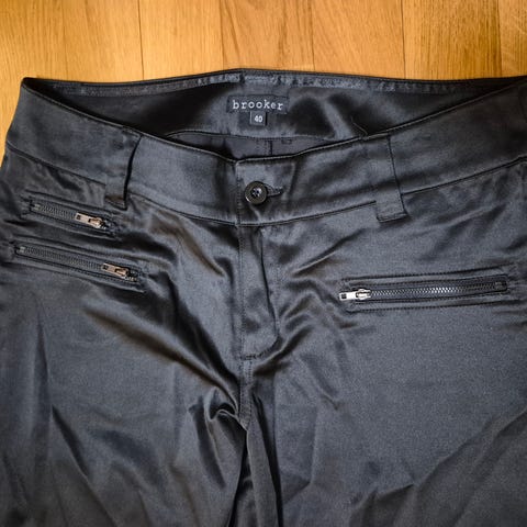 Mustat kapealahkeiset, hieman joustavat housut. Vetoketjulliset pienet taskut. Vyönlenkit.