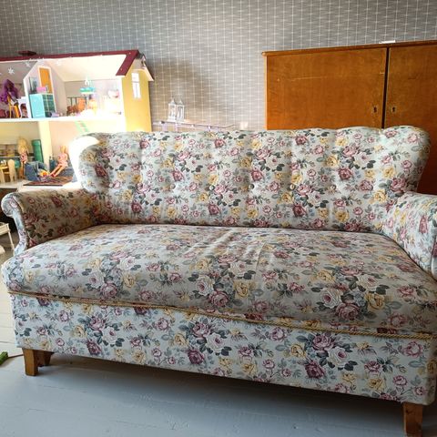 Upealla kankaalla verhoiltu vanha sohva ja rahi. Sohvan koko 175 x 70, kork 110 cm. Edessä näkyvissä muutama pieni jälki joista lakka on irronnut. Muuten tyylikkäässä kunnossa. raskain mielin Kai tästä on luovuttava että saa kaupasta puuroaineksia. Kuljetus onnistuu erikseen sovittaessa.