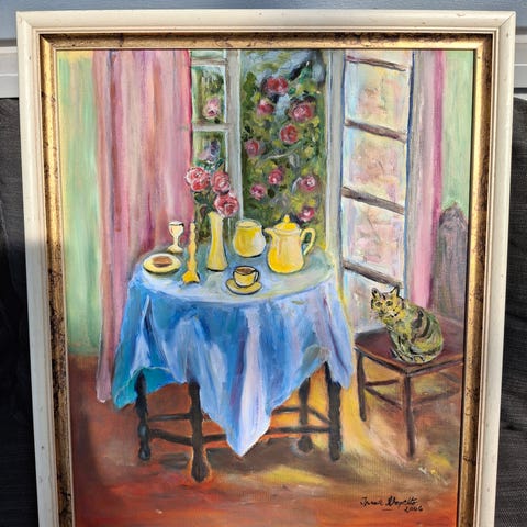 20x20cm 7.2020 150 €pick up,. if by post. painted in my little art/music room in our house in Joensuu. The teapot and wooden utensils came from a kirppimarket. Sun is rare here and caught the light while I could.