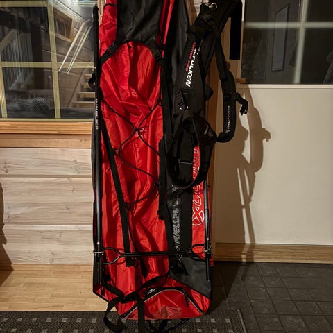 Paketti sisältää ahkion, suojapeitteen, vetoaisan ja vetovaljaat/-vyön.