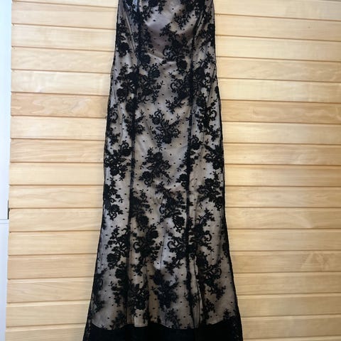 Käyttämätön iltapuku kauniilla pitsikoristelulla. Rinta osa kevyesti topattu. Sivussa vetoketju. Koko 40.