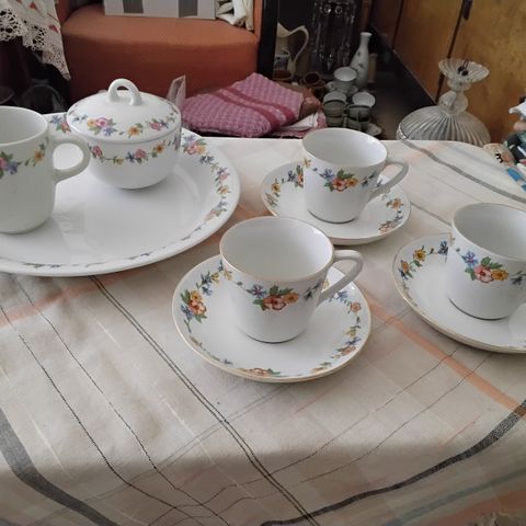 Arabian Kukkakranssi kahvikupit aluslautasineen 5 kpl sekä lisäksi aluslautasia 5 kpl. Kupit ovat olleet hyvin vähällä käytöllä. Kultaukset hyvin säilyneet, ei tiskattu tiskikoneessa.