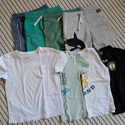 Hyväkuntoinen shortsipuku ja hellehattu. Koko 110/116 molemmissa.