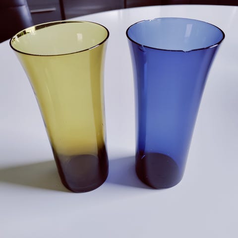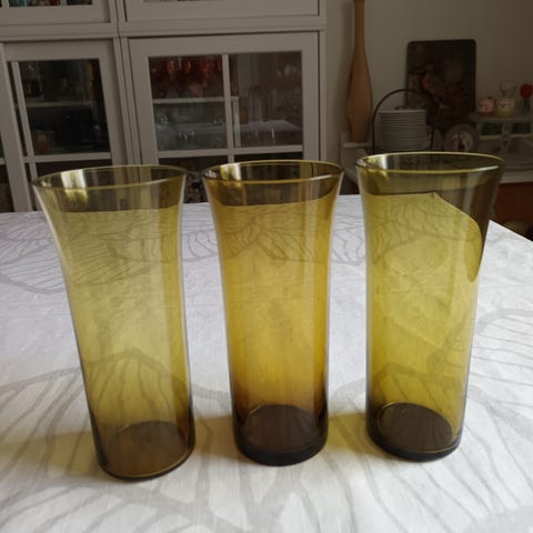 Design Kaj Franck, suunniteltu 1959. Tarjolla 2 kpl kellertävän ruskea lasi / mehulasi, jonka korkeus on 15 cm, suuaukon halkaisija 6,7 cm ja tilavuus 25 cl. Lasit ovat täysin ehjiä ja hyväkuntoisia, mutta kuitenkin jonkin verran käytössä olleita. Hinta on kahden lasin yhteishinta.