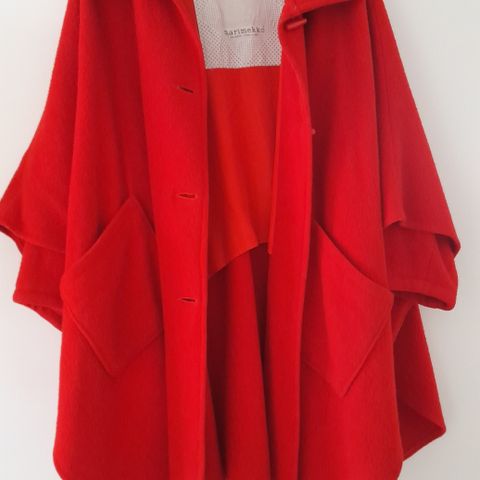 Myydään kuvien laadukas ja lämmin MARIMEKKO-villakangastakki, joka mittojensa ja muutenkin yksinkertaisen mallinsa ja pituutensa (hieman laatikkomainen lyhyt malli) vuoksi erinomainen esim. autoiluun. Mallissa myös shaalikaulus, takin virallinen mallinimi "Tenho".