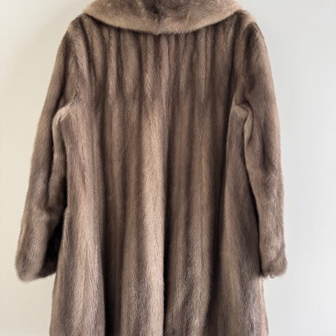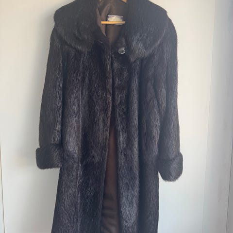 Naisten ruskea aito minkkiturkki koossa L.Pitkä, täyspitkän mallinen takki, jossa minkkiturkki päällinen ja sileä vuorikangas Kuvissa näkyy takin pituus- ja leveysmitta, jotka auttavat koon arvioinnissa. Taskut sivuilla ja edessä kiinnitys hakasella. Merkki U.Valtonen Oy Helsinki