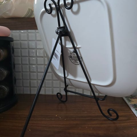 Hyväkuntoinen Ikean lautasteline. Pohjassa säätö jolla telineen väliä saa muutettua.