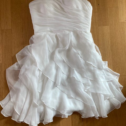 Myydään kaunis epäsymmetrisellä helmalla oleva häämekko. Soveltuu toki myös muihin tarkoituksiin. Väri kirkas valkoinen.