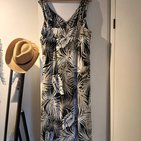 Janina Frostel - merkkinen vuorellinen kesämekko. Helmassa molemmin puolin n. 40 cm pitkät halkiot. Ihana materiaali, ei rypisty ja joustaa.
