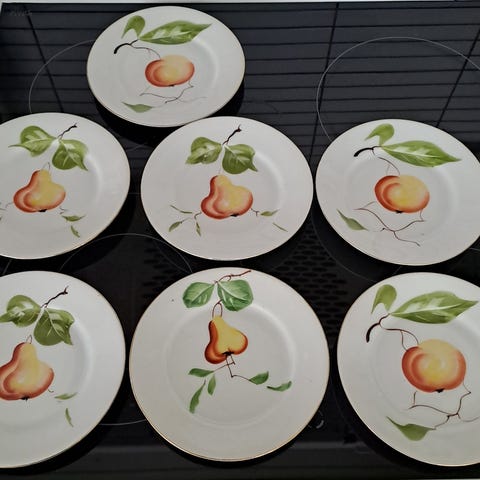 Myydään neljä erilaista leipä/pullalautasta hedelmäkuviolla. Halkaisija 15cm