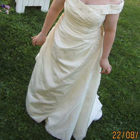 Hääpuku, kauniilla strassikoristeella. Takana nyöritys ja laahus, jonka saa napilla nostettua ylös. Yhdet häät juhlittu ja juhlien jälkeen pesetetty.