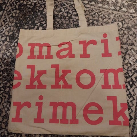 Myydään uusi Marimekko logokassi, jossa on pinkinsävyinen häivytetty teksti.
