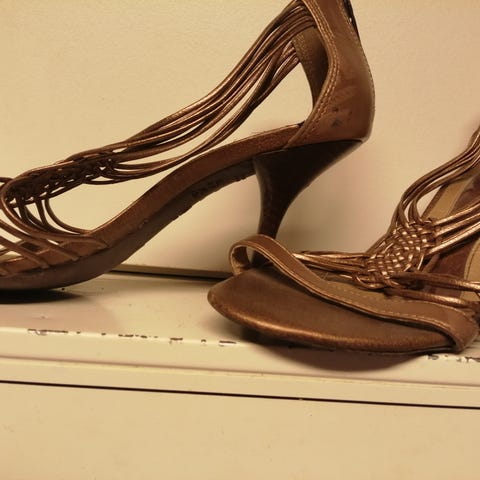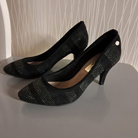 Eledanttiset korkoikengät, tummaharmaa, violetti kiilto, koko 36,5, 2 euroa.