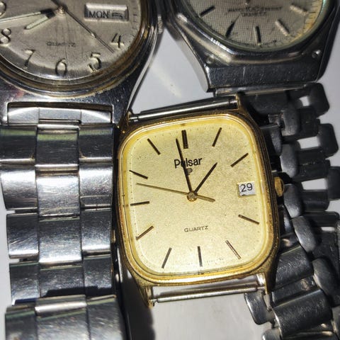 Pulsar (15eur) ja Lorus (15eur) merkkiset rannekellot. Nahkaremmit. Paristo loppunut molemmista.