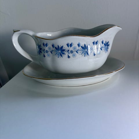 Aune Laukkasen Arabialle suunnittelema Fenno -sarjan kastikekulho. Kultareuna.
