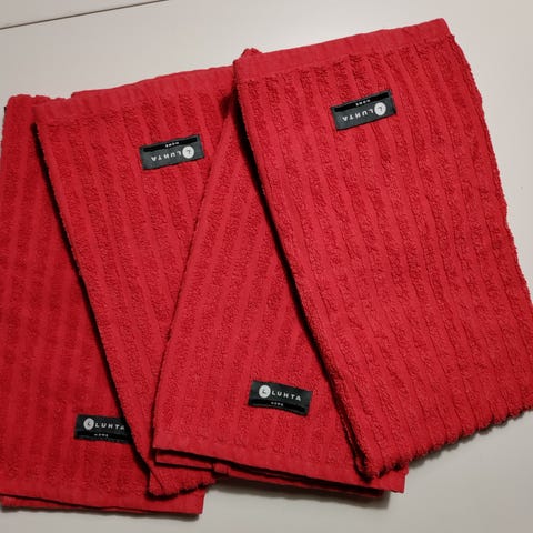 Luhta Home esiliina ja patalappu. Esiliina on pesty ja silloin koristeelliset, kultaiset kuviot haalenivat. Patalappu on käyttämätön. Esiliina koko on 56 x 82 cm plus nauhat. Patalapun koko on 21 x 21 cm, ja siinä on toppaus sekä lenkki ripustamista varten. 100% puuvillaa.