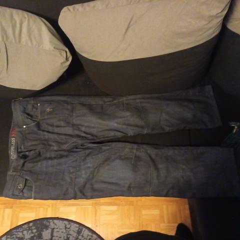 Kolmisen vuotta sitten ostetut, mutta käyttämättömäksi jääneet miesten ajofarkut. Laput vielä paikallaan. Sen vuoksi kuntoluokitukseksi valittu uusi, vaikka niiden ostamisesta onkin aikaa. Koko:: 42L (vyötärön ympärys 42 tuumaa; Long, pidempi lahje). Ks. myös esim. tämän linkin myötä löytyvä kokotaulukko: