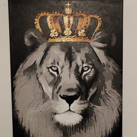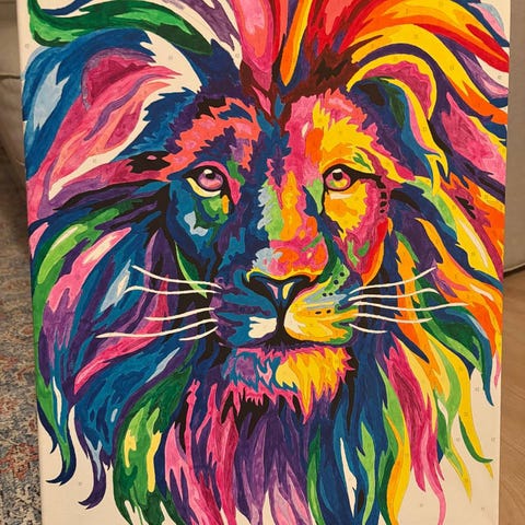 Barbarileijona 40x30 kokoinen (cm) akryylimaalaus kangaspahvipohjalle, ei ole kehystetty. Saa laitettua seinälle sellaisenaankin ilman kehyksiä. Teoksen pinta on suojattu vernissalla