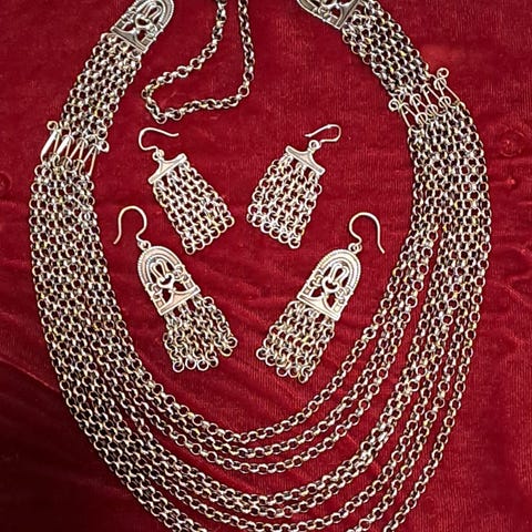 Kaulakoru, korvakorut ja rannekoru. Lisäksi kaulakorun pidennyspala.