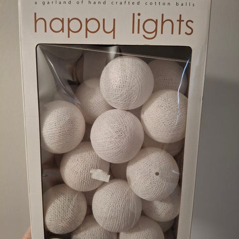 Happy lights valkoiset pallot ilman valosarjaa(kuva tulossa) sekä 2kpl paristoilla toimivaa pallovalaisimia.