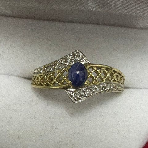 Kultainen sinisafiiri/ timantti sormus, 8 timanttia. Koko 16,5-17.