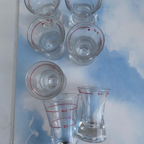 Käyttämättömät ehjät kupit, lasit ja mittalasi.